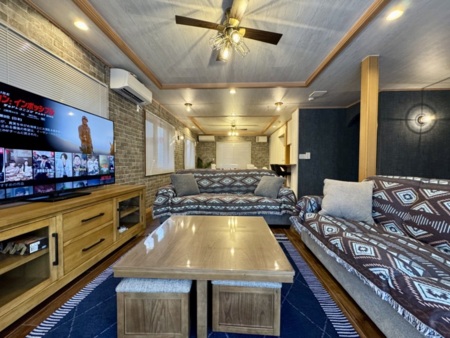 「わらゆん家」は、"新月伐採木"を使用したハンドカットフルログハウスで、直径40cmの丸太が使用された壮大な造りが特徴です。自然の香りに包まれたログハウスでの滞在は、まさに非日常の体験。高級感溢れる空間で、日常を忘れるような時間を過ごせます。